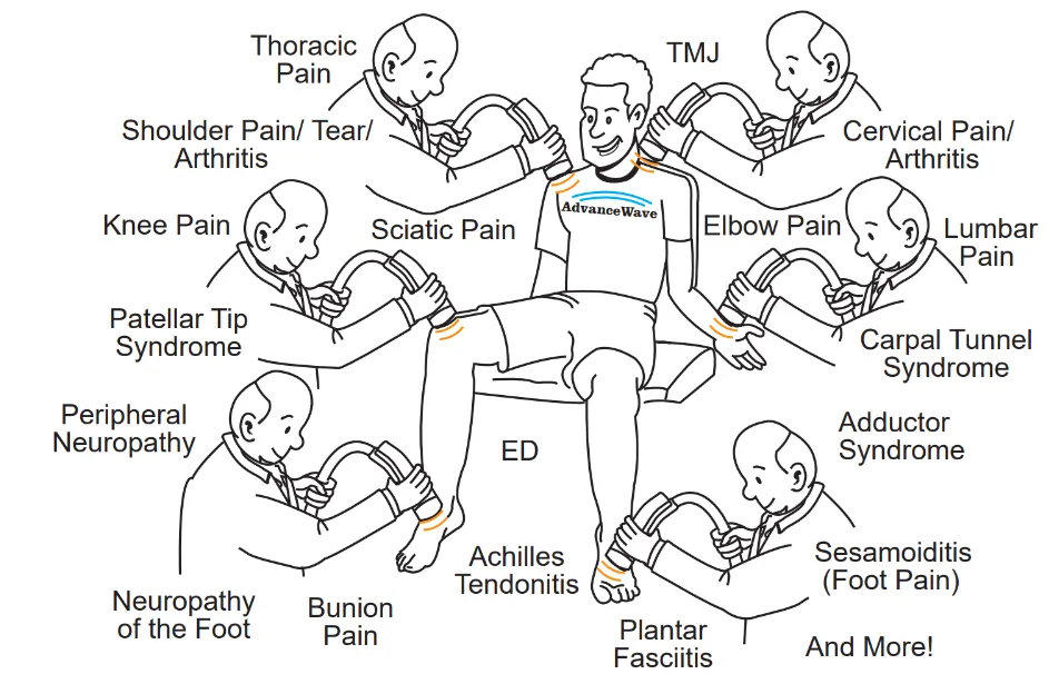 AdvanceWave provides Non-invasive Extracorporeal Shockwave Therapy that uses high energy sound waves to provide therapy for various conditions. No therapy works 100% of the time, but the available literature mirrors our experience in providing improvement for most people.